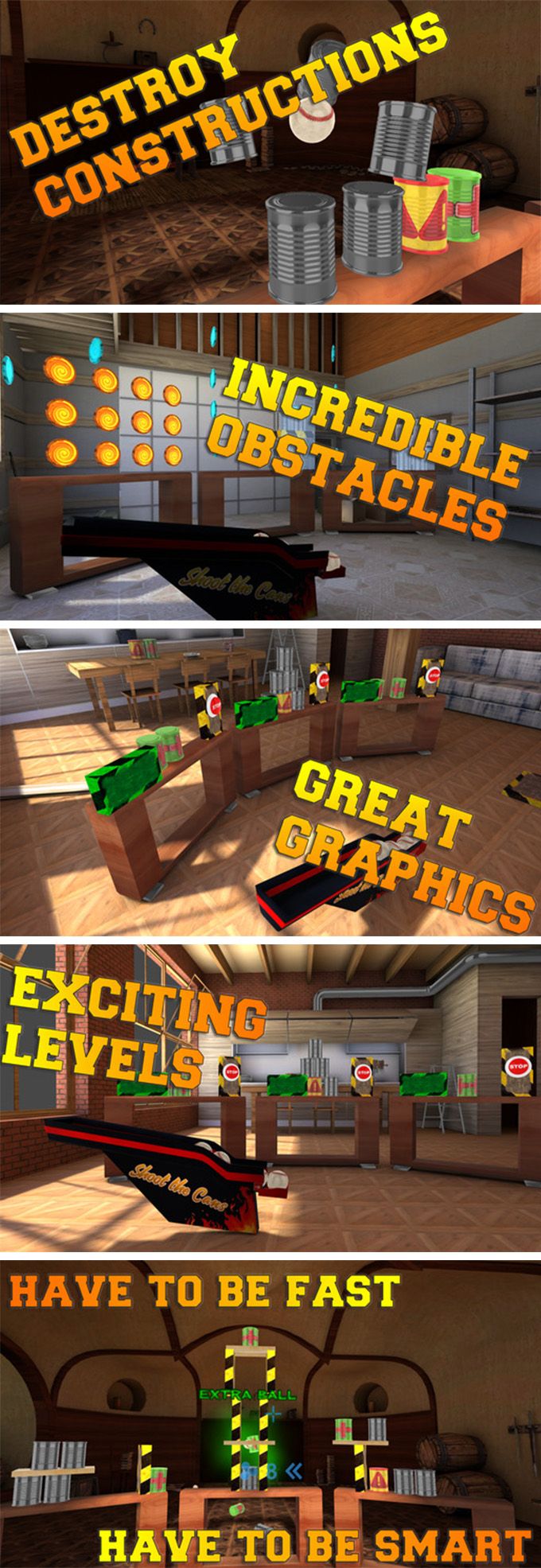 Захватывающие уровни, непредсказуемые конструкции, невероятные препятствия ждут Вас в Shoot the Cans!
